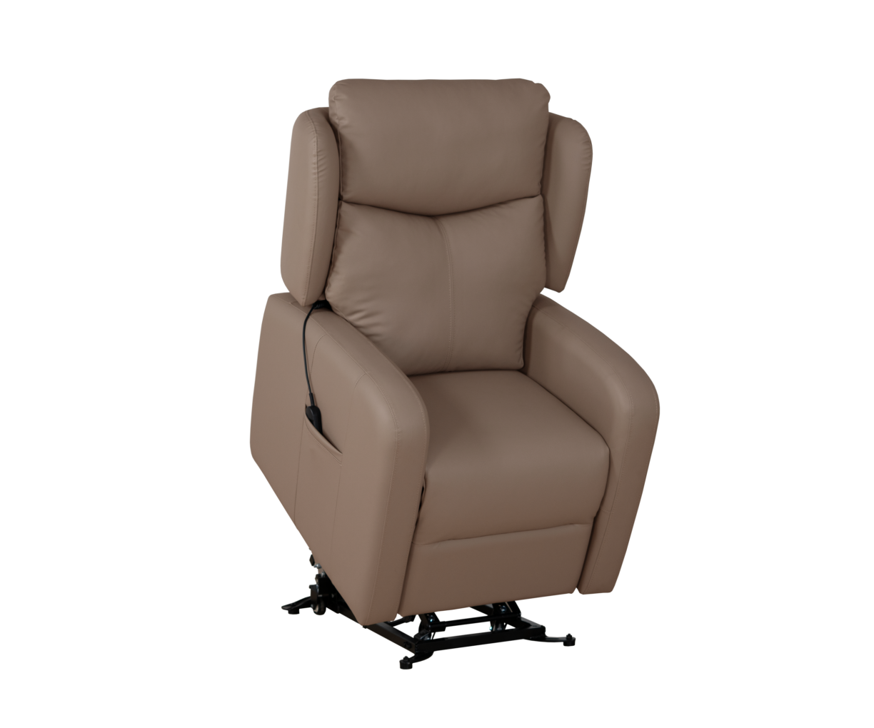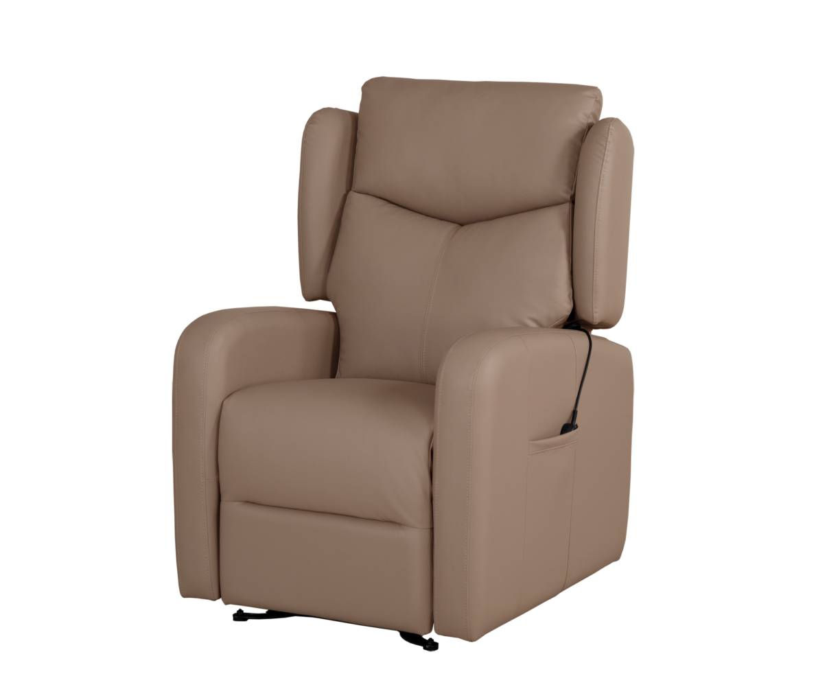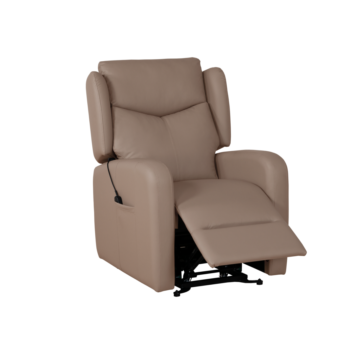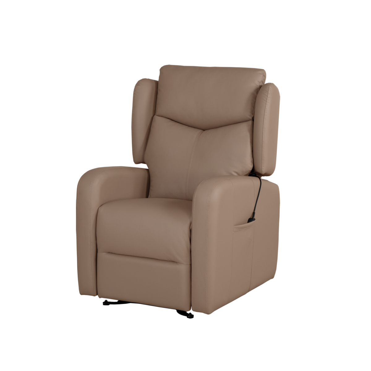 - Equipado com comando de manuseamento extremamente fácil e intuitivo, com funcionalidades centralizados em apenas dois botões. O botão da esquerda aciona o mecanismo que levanta o apoio das pernas e reclina as costas. O botão da direita coloca o cadeirão de volta à posição original. Quando se continua a premir o botão da direita, é acionado o mecanismo sénior, que permite levantar o cadeirão até deixar o seu ocupante numa posição quase vertical para um sentar e levantar sem esforço.
