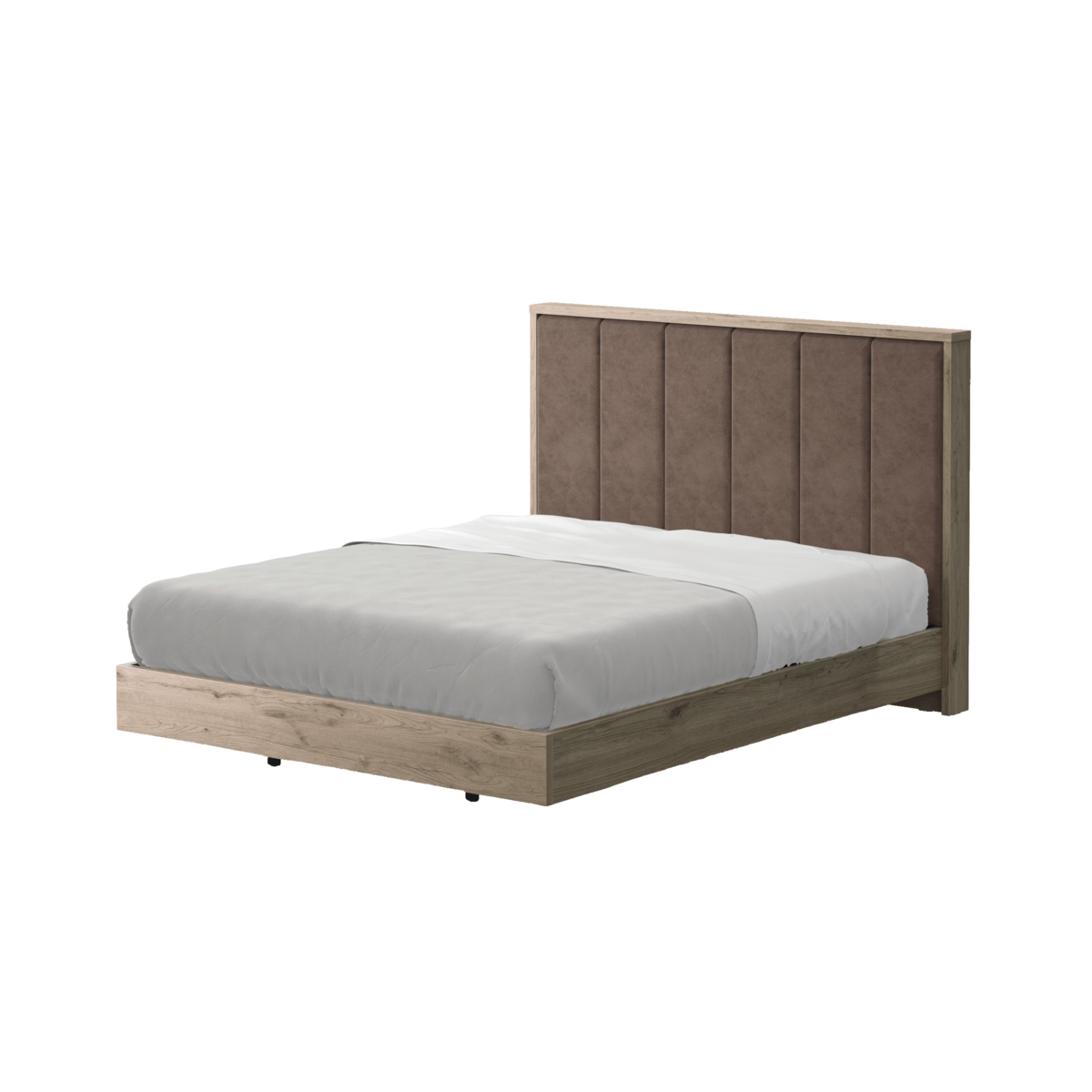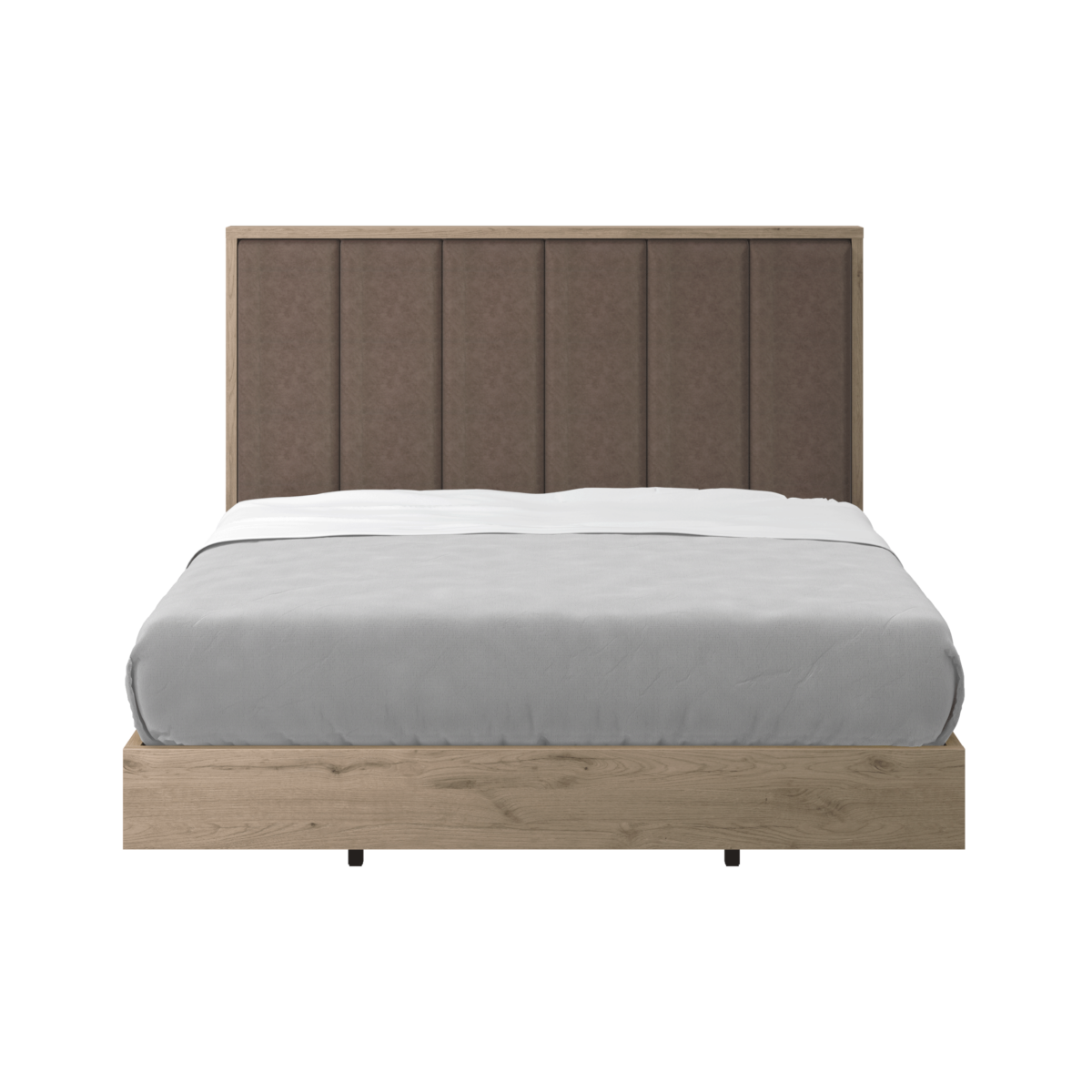 - Alia a solidez da estrutura em tom oak à sensação de conforto e bem-estar proporcionada pela cabeceira estofada em tecido não personalizável — perfeita para momentos de descanso ou leitura.